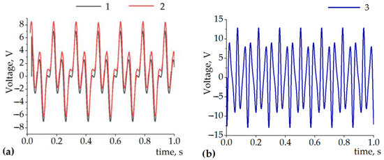 (a) 1—measured and 2—simulated (shifted + 1 V) output of a single coil when T = 18 mm, p = 12 mm, the amplitude of the sinusoidal excitation was 12.5 mm, and oscillating at 6.6 Hz.; (b) 3—simulated voltage under equivalent conditions with T = 10 mm and p = 5 mm.