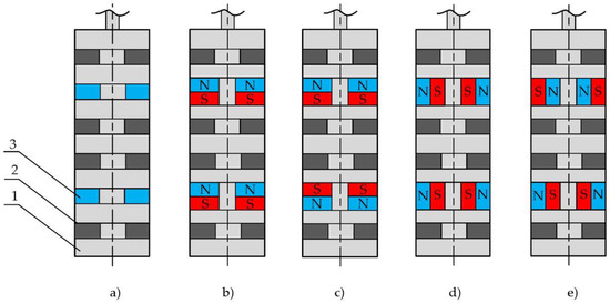 Versions of the magnet orientation in a slider (drawings are not to scale): (a) Overall geometry and dimensions of a slider. 1—non-magnetic material; 2—MRF insert; 3—magnet. (b) Unidirectional axial. (c) Counter-directional axial. (d) Unipolar radial. (e) Differential radial.