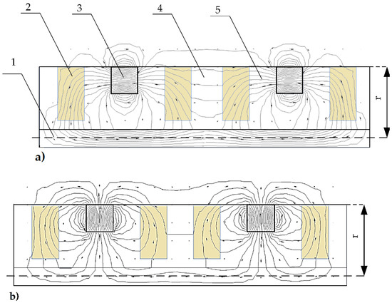 The optimization was performed by solving the magnetostatics problem using the finite element model in the software package Quickfield. A graphical representation of the magnetic potential lines and the magnetic flux density vectors in two cases, representing a unidirectional axial orientation (Figure 5b) and a differential radial orientation (Figure 5e), are shown in Figure 6a,b, respectively. The other two cases (Figure 5c,e) of magnetic field propagation had intermediate results between the shown cases and did not show any additional information; therefore, they are not shown. In Figure 5, the magnetic potential lines and magnetic flux density vectors are shown along the slider structure in the axisymmetric model (the symmetry axis is at the bottom of the structure), where 1—magnetic steel axis; 2—MRF inserts; 3—magnet; 4—non-magnetic material; 5—magnetic field lines; and r—radius of the slider. One can observe the significant difference in the magnetic field lines that go outside of the structure. The axial orientation of the magnets (Figure 6a) causes the magnetic field lines to close mostly at the inner part of the system, particularly at the damper axis (the bottom-most part of the geometry). In addition, according to the picture, the dominating direction of the magnetic flux density vectors outside of the structure point was from left to right, with very weak fractions going in the opposite direction. This indicates that only insignificant changes in the magnetic field will interact with the coils (not shown in Figure 6) during the axial motion of the slider. In contrast, the radially and differently oriented magnets (Figure 6b) provided a significant portion of the magnetic field to the outside of the structure, and the magnetic flux density vectors changed their strength and direction along the surface of the slider. We considered the last type of magnet orientation to be the optimum since the peak-to-peak amplitude of the magnetic flux density was maximum. The role of the MRF containers (2) (Figure 6) in both cases was similar to an equivalent solid ferromagnetic structure.