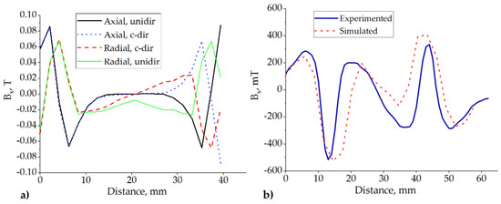 Magnetic flux density profiles along the surface of the slider: (a) All four magnet orientations simulated with a low resolution and reduced dimensions (see also Figure 5b–e). (b) Optimal setup of magnet orientations; simulation compared with the measurement.