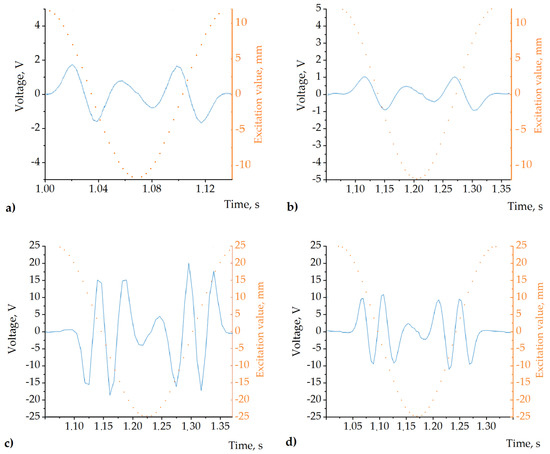 Results of the experiment. (a) Output voltage captured at 7 Hz and = 12.5 mm. (b) Output voltage captured at 4 Hz and 12.5 mm. (c) Output voltage captured at 7 Hz and 25 mm. (d) Output voltage captured at 4 Hz and 25 mm excitation. The dotted line schematically illustrates the excitation value at each time moment in all cases; it corresponds to the scale annotated on the right-side axis.