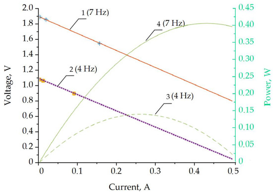 The loading of the coil output with different resistances allowed us to estimate the useful electrical energy produced. The estimated load and power characteristics for 4 Hz and 7 Hz excitation at a 25 mm sinusoidal amplitude are shown in Figure 10. The asterisk markers indicate the measured values corresponding to the 1 kΩ, 100 Ω, and 10 Ω loads. The data in the graphs were linearly extrapolated from these experimental data points considering the root-mean-square (RMS) voltage and current values. The power output in the graph is estimated as a product of the RMS voltage and current.