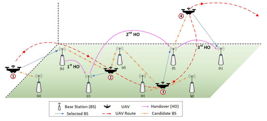 The goal of the proposed UHD scheme is to design a handover execution policy that ensures enforcement of necessary handovers at UAVs while maintaining stable connectivity with the ground cellular network. The mobility of UAVs is a three-dimensional (3D) trajectory with variable altitude, and during the flight they perform one or more handovers to maintain communication, as shown in Figure 2. The UHD scheme monitors a received RSSI from BSs at a UAV in a sampling period, and after every period determines whether or not to perform a handover to the target BS with strongest RSSI. In addition to the RSSI, the UHD takes into account several other factors such as location, position, direction, and speed of UAVs while making the handover decisions. In the case of a positive handover decision, the system initiates the control signaling procedure to disassociate the UAV from the current BS and associate it with the target BS. Although the proposed UHD scheme manages handover decision requirements for multiple UAVs, the rest of this paper presents and evaluates a UHD from the perspective of single UAV for clearer understanding and precision.