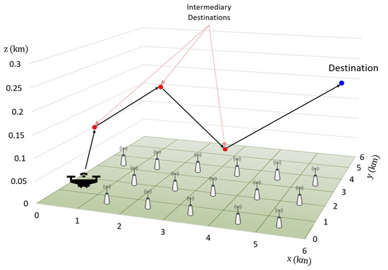 Mobility Model: The proposed UHD scheme enforces policy-based handover decisions on UAVs during flight along the given trajectory. In reality, a UAV trajectory is either predefined or controlled by a remote pilot. However, to implement a trajectory in a UHD environment, the UAV flies from a starting point to a destination using an RWP mobility model [18,34], which requires destination, speed, and direction to be randomly chosen. To implement an RWP, (1) start and destination points of the UAV trajectory are randomly selected in the environment; (2) three intermediate destinations between the starting and destination points are randomly selected, as shown in Figure 4. The UAV flies in a straight line from the starting point to the first intermediate destination (as shown in Figure 4) with a constant velocity in the range of 54–72 km/h based on the average speed of industrial UAVs [35]. Upon reaching the first intermediate destination, the UAV changes direction along the shortest path to second intermediate destination, which also includes altitude variation, and randomly selects the velocity value from the preset range. This process continues till the UAV completes a trajectory by reaching its destination, and then repeats the procedure for different trajectories. It is worth mentioning that the UHD is trajectory agnostic and depends only on the RSSI and current UAV state to make a handover decision; hence, UAV trajectories in a real environment do not affect UHD performance.