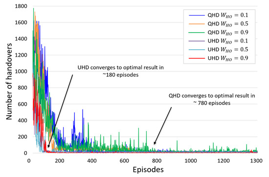 The networks in a DRL algorithm are generally initialized with random values and require an exploration phase where they learn from the reward values of corresponding actions and converge towards optimal policy. As the exploration happens while the system is online, it is important that this algorithm converge to optimal value as soon as possible. Figure 5 compares the convergence time of a PPO algorithm in a UHD and Q-learning in a QHD scheme [8] for different values in the reward function. The results show that use of single weight value in a UHD avoids the conflicting objectives and enables the PPO algorithm to converge 3.5 times faster than the QHD: the UHD takes about 100 episodes to converge, whereas the QHD takes about 800–1200. Here, each episode represents a single trajectory, and different values show broadly similar convergence rates for both the UHD and QHD. The clipping method in the PPO algorithm controls the wide variations in policy and helps it to converge with a higher rate. Moreover, the convergence and handover decisions of a UHD further improve with multiple UAVs as more data with diverse characteristics is collected in the trajectory memory in a shorter time.