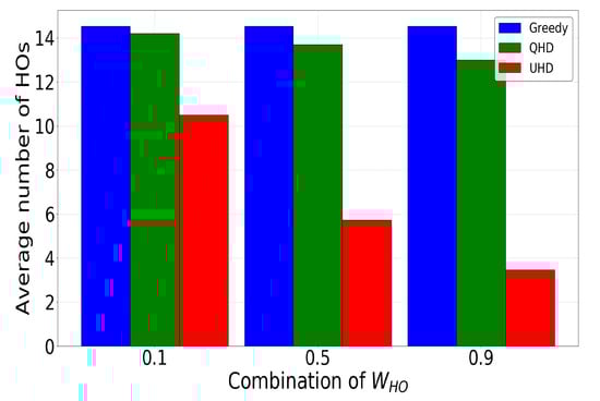 Comparative analysis among UHD, QHD, and greedy methods for the average number of handovers (HOs) in the exploitation phase.