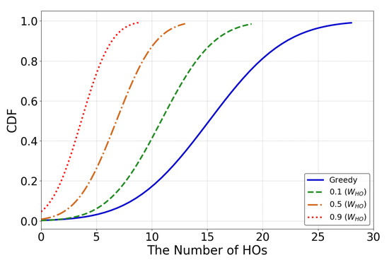 The average number of handovers showed the overall performance of the UHD, but did not provide detailed insight into UAV handovers in the trajectory. We addressed this by showing a cumulative distribution function of UHD handovers during a trajectory for 0.1, 0.5, and 0.9 values in Figure 7, and compared them with the greedy approach. The results confirmed the findings of Fiigure 6, and showed that the UHD significantly reduced handovers in comparison to the greedy approach when was 0.9. The number of handovers increased and became closer to th egreedy approach when the value decreased to 0.5 and 0.1. These results highlighted the better performance of the UHD reward function, which used a single handover weight value to control the handovers and the RSSI at the UAV. The higher weight value made the UHD maintain the connection with the current BS and compromisef on signal quality, whereas the lower weight value inclined the HD towards attaining a better signal quality by making more frequent handovers. In summary, by eliminating conflicting goals, the UHD enables UAVs to maintain either high signal quality or more seamless communication depending upon the service requirements.