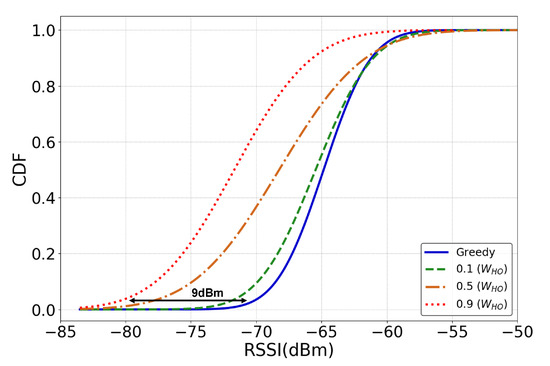 The UHD reduced the handovers in a trajectory by persistently maintaining a connection with the current BS. This could also be perceived as a drawback of the scheme if the connection persists even after the signal quality deteriorated below the stable communication threshold ( < −85 dBm) as shown in Table A1 in Appendix A. To analyze the effects of handover reduction on the RSSI at the UAV, we measured the RSSI of the current BS at the UAV during a trajectory under the greedy scheme and the UHD with values 0.1, 0.5, and 0.9. The results in Figure 8 illustrate that the greedy scheme maintained a good to excellent RSSI (−70 dBm to −60 dBm) at the UAV throughout the trajectory. However, the UHD with a lenient handover curtailing policy () reduced handovers by 28% while maintaining a good RSSI above −70 dBm for more than 90% of the trajectory. For a more strict handover curtailing policy (), the RSSI at the UAV for most of the trajectory dropped but still remained in the good signal strength range of −75 to −60 dBm for high data rates. The biggest drop in the UAV RSSI comes with the highest reduction in handovers with , but more than 90% of the trajectory RSSI values stayed above the fair signal strength of −80 dBm for reliable communication. From this, it can be concluded that the proposed DRL framework in a UHD successfully achieves the tradeoff between reduced frequency of handovers and signal strength for reliable communication.