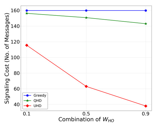 The elimination of unnecessary handovers not only facilitates stable communication but also reduces control signaling costs for the mobile operator. An analytical analysis of handover signaling costs in one trajectory for the UHD, QHD, and greedy conventional method is shown in Figure 9. The cost is calculated by using the number of handovers in a trajectory and the number of signaling messages exchanged between the UAV and BS for a single handover [36]. The results showed that the UHD reduceds the signaling cost for a UAV in a trajectory maximum by 120 and 112% in comparison to the greedy and QHD methods, respectively, with . Even when the handover weight value was low (), the UHD achieveds 32 and 29% lower signaling cost than the greedy and QHD methods, respectively. These results showed that the UHD significantly reduced the network signaling load and reduced energy consumption in UAVs due to fewer transmissions, which increase UAV flight time.