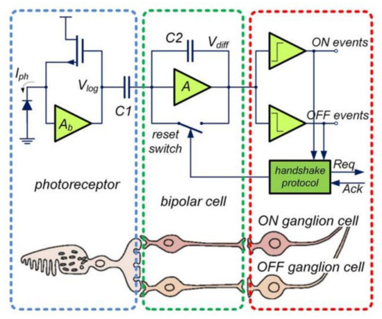 The main design principle of an event-based pixel is to mimic the performance of the mammalian retina. The mammalian retina is a complex structure that is composed of ten layers in total [12]. The structure and density of light-sensitive cells, bipolar neurons, ganglion cells, and others are too complex to replicate in silicon, hence the pixel realization requires simplification. The simplified, event-based pixel is composed of three layers: the photoreceptor layer, the outer plexiform layer, and the inner plexiform layer [13]. These three layers have a complexity of cells which are further reduced to the cone or rod photoreceptors, ON/OFF bipolar cells, and ON/OFF ganglion cells. The combination of these cells is the optimal structure for a silicon retina that can be utilized for most imaging applications while still mimicking the mammalian retina. The silicon equivalent replicates this structure by introducing a photoreceptor, a differencing circuit (bipolar cells) and a couple of comparators (ganglion cells) [14]. The circuit realization is shown in Figure 1. This structure was also adopted to create the first very-large-scale integration (VLSI) silicon retina [15]. Since then, the silicon retina pixel architecture has become standard and has not been changed very much, like the active pixel sensor (APS) pixel architecture that is utilized in standard CMOS image sensors [16].