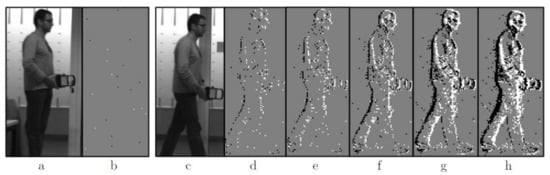 Silicon retina sensor in comparison to a conventional monochrome sensor. White pixels (off-events), Black pixels (on-events), Gray pixels (no events). (a) Person without movement in front of the monochrome sensor, (b) silicon retina output without movement, (c) person walking in front of the monochrome sensor, (d–h) silicon retina data from the walking person with collected events over a time period of 5 ms, 10 ms, 20 ms, 40 ms and 60 ms [35].