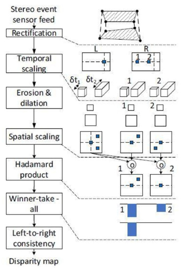 First, the rectification corelet is used to map each pixel in the left and right sensor’s rectified space, to a pixel in the left and right sensor’s native resolution, respectively. Later, the multiscale temporal representation is used to add invariance across event rates because event rates are dynamic. Next, morphological erosion and dilation are used to denoise the image. The neuron potentials are initialized to zero and set to zero upon producing a spike. Later, spatial scaling is applied in order to extract coordinates where events form a feature vector. The Hadmard product is calculated for each pair of spatiotemporal coordinate tensors and is used for matching. Subsequently, the Hadmard product is converted to thermometer code. Finally, a winner-take-all feed-forward neural network is implemented which takes the generated thermometer code and finds the disparity with the largest value at every process clock tick. In the end, a left–right consistency check is performed to check whether the left-rectified pixel (p) matches a right-rectified pixel (q) and vice versa. The process is illustrated in Figure 4.