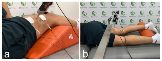 Ultrasound imaging was acquired using a clinical scanner (Acuson Redwood; Siemens Healthcare, Mountain View, CA, USA) equipped with the 10L4 linear array transducer. To assess muscle stiffness, the machine uses virtual touch tissue imaging and quantification technology, where acoustic push pulses are sent to generate shear waves which are tracked using detection pulses to estimate the velocity of the shear waves. The shear waves velocities are later converted to Young’s modulus unit in kilo Pascals (kPa) to reflect tissues stiffness []. A circular region of interest with a diameter of 1 cm was selected in the belly of each muscle []. An operator with more than 5 years of experience in musculoskeletal elastography and 11 years of experience in ultrasonography recorded all SWE measurements. Participants rested for five minutes in a supine position prior to their SWE assessment. All measurements were performed in a resting state without any active muscle contraction or external stimulation. Measurement locations were marked with a dermatological pen to be reproduced in the TMG test. For the VL, the probe was placed at 30% of the length from the patella to the greater trochanter when the participant was in a supine position and the leg was rested on a wedge foam pad at 30° passive flexion (Figure 1a) [,]. For BF, the participant was in a prone position and the knee flexed by a 15° roll cushion; the probe was placed at 50% of the length between the ischial tuberosity and lateral condyle (Figure 1b) [,]. The transducer was placed on the skin with minimal pressure ensuring good contact and no external compression force. Due to the anisotropic anatomy of skeletal muscles, the transducer was oriented along the muscle fibers to yield reliable and valid results as recommended in previous studies [,]. Three repeated measurements were acquired for each muscle and the average was used for the analysis []. The measurements were recorded in kPa and checked for consistency in results to m/s.