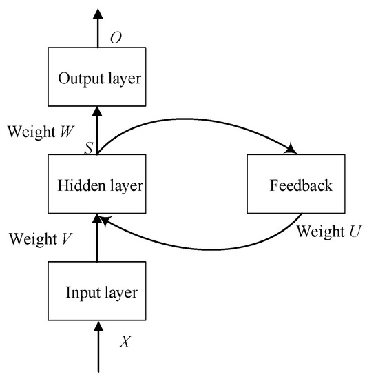 Execution of RNN includes two phases: the first phase is for forward data propagation and the second phase is for backward error propagation. Denote the input vector of input layer as X, and the output vectors of hidden layer and output layer as S and O, respectively. Meanwhile, set the weight parameter matrix from the input layer to hidden layer as V and the weight parameter matrix from the hidden layer to output layer as W, respectively. Similarly, U presents the parameter matrix of the ring structure in the hidden layer. Defining the number of neurons in the input layer, hidden layer, and output layer is n, m and o, respectively. In the first phase, the input and output of the j-th hidden layer neuron could be expressed as follows [26]: