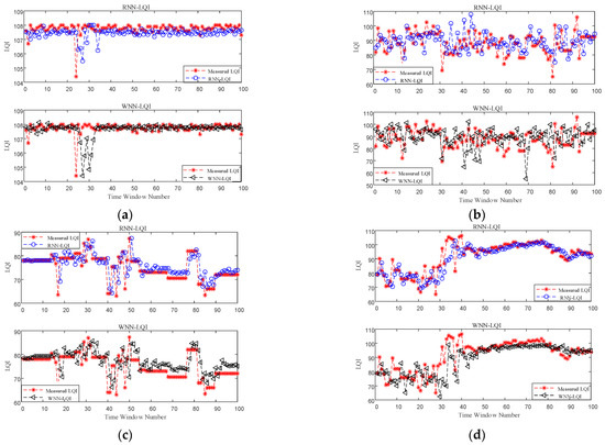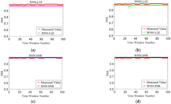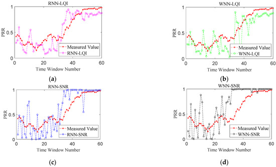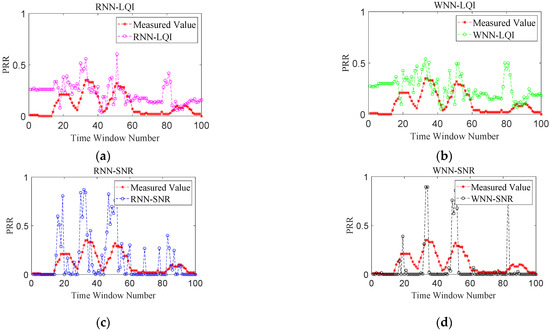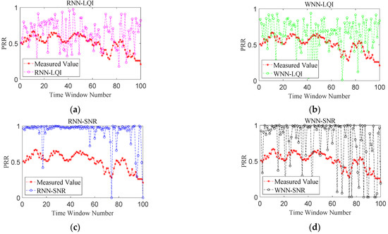 Firstly, the performance improvement benefited from considering the temporal correlation of LQI series was analyzed. Only the accuracy of RNN-LQI and WNN-LQI in predicting LQI was compared, and no mapping to PRR was conducted. Figure 6 shows the predicted LQI and measured one for these two methods under different link qualities, in which the Time Window Number denotes the number of time windows used to computing the mean value of LQI. It is obvious that under good and bad links, prediction effects of these two methods are both very good and the predicted LQIs of RNN-LQI are closer to the measured ones. Under moderate links, the predicted LQI of WNN-LQI fluctuates greatly, and the error is as high as 22. In comparison, the predicted LQI of RNN-LQI is closer to the measured one. Under sudden changed links, although WNN-LQI is able to keep up with the sudden change faster, its prediction is not accurate after the link becomes stable. In contrast, the prediction of RNN-LQI is more consistent with actual fluctuations. Combining Figure 6a–d, it can be found that the proposed RNN-LQI is superior to WNN-LQI under different link qualities, which could be attributed to the fact that RNN considers the temporal correlation of LQI series.