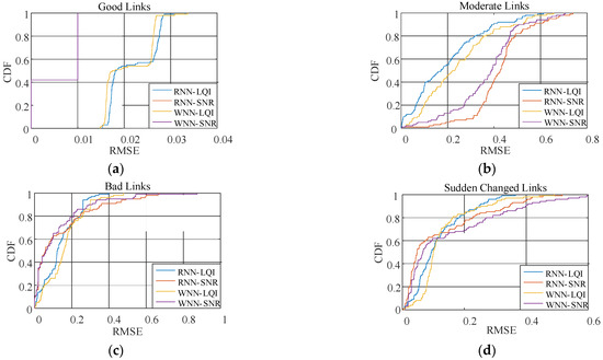 CDF of the RMSE for PRR prediction under different link qualities. (a) good links, (b) moderate links, (c) bad links, (d) sudden changed links.
