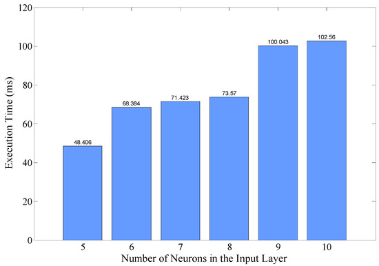 Execution time with different number of neurons in the input layer were also evaluated, also shown in Figure 13. It should be noted that when the number of neurons changes, the model should be retrained on desktop and deployed again on sensor nodes. As expected, the execution time reduces when the number of neurons decreases. However, with the number of neurons decreased, the accuracy of prediction will be affected inevitably, as less historical information could be utilized. Tradeoff should be made according to the specific needs of accuracy and execution time in practice.