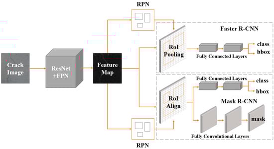 The pipeline of Faster R-CNN [28] and Mask R-CNN [29] is presented in Figure 1, where it can be divided into three main components. (1) Feature extraction: we employed ResNet [30] and FPN [31] as feature extractors for Faster R-CNN and Mask R-CNN. The feature extractor sends five feature maps of various sizes to the following network after feature extraction. (2) Region proposal networks (RPNs): five identical RPNs obtained five feature maps, which were then utilized to generate region proposals. Specifically, RPN generates anchors of different sizes to obtain the specified number of region proposal feature maps. (3) Region CNN (R-CNN): the R-CNN component of Faster R-CNN unifies the feature maps of the region proposal into the same size and then feeds them all into the fully connected layer for classification and regression. For Mask R-CNN, a full convolution branch is added to implement the instance segmentation task.