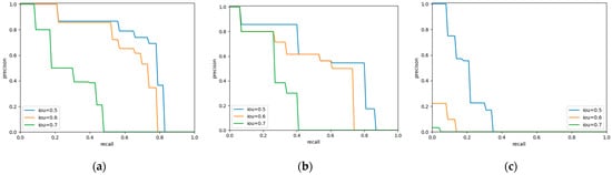 Precision-recall curve of bounding-boxes in different models. (a) Faster R-CNN. (b) Mask R-CNN. (c) YOLO v3.