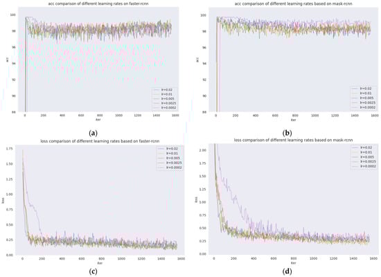 In Figure 5, different learning rates of Faster R-CNN and Mask R-CNN are presented where Figure 5a shows the acc comparison of five learning rates for Faster R-CNN; Figure 5b shows the acc comparison of five learning rates for Mask R-CNN; Figure 5c shows the loss comparison of five learning rates for Faster R-CNN; and Figure 5d shows the loss comparison of five learning rates for Mask R-CNN.