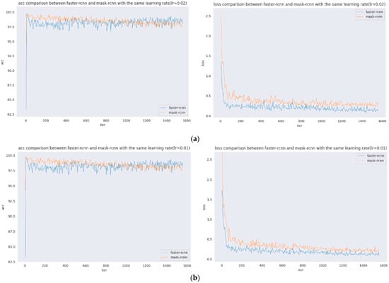 (iv) The acc and loss of Faster R-CNN do not differ much under the five learning rates set in this experiment, and the case of Mask R-CNN is the same as that of Faster R-CNN.