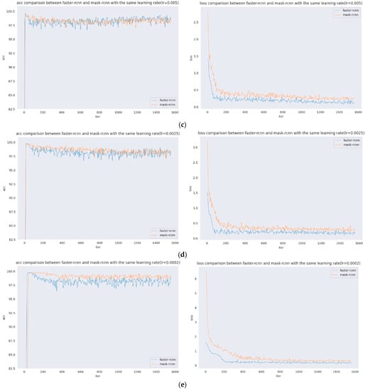 In Figure 6, this set of images shows the acc and loss comparison between Faster R-CNN and Mask R-CNN with the same learning rate, where Figure 6a shows the acc and loss comparison between Faster R-CNN and Mask R-CNN when the learning rate is 0.02; Figure 6b shows the acc and loss comparison between Faster R-CNN and Mask R-CNN when the learning rate is 0.01; Figure 6c shows the acc and loss comparison between Faster R-CNN and Mask R-CNN when the learning rate is 0.005; Figure 6d shows the acc and loss comparison between Faster R-CNN and Mask R-CNN when the learning rate is 0.0025; and Figure 6e shows the acc and loss comparison between Faster R-CNN and Mask R-CNN when the learning rate is 0.0002.