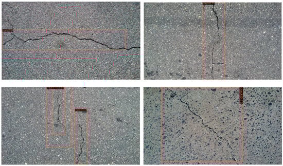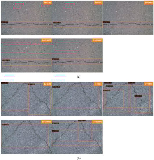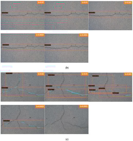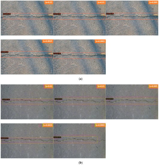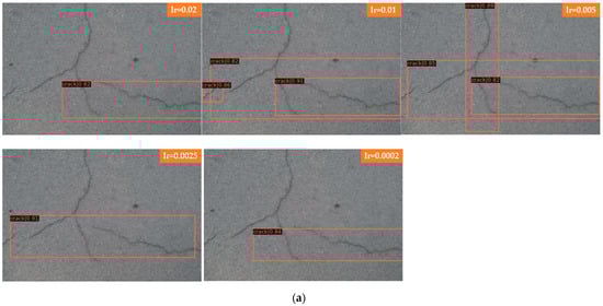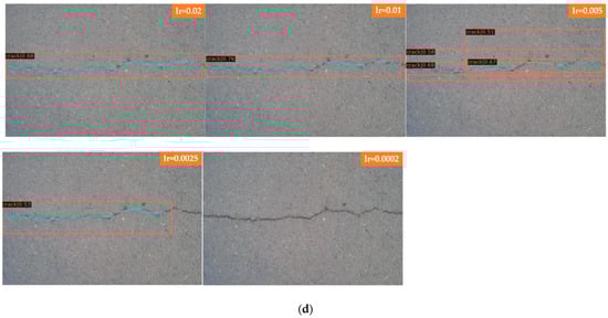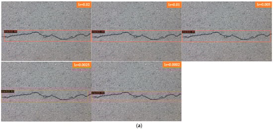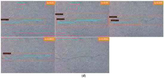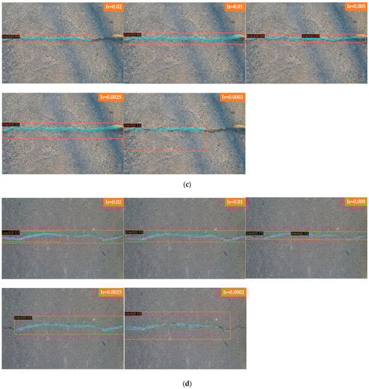 In Figure 10, Faster R-CNN and Mask R-CNN are compared, and the detection results of four groups with different learning rates are presented, where Figure 10a for Faster R-CNN to detect laterally biased cracks; Figure 10b for Faster R-CNN to detect curved cracks; Figure 10c for Mask R-CNN to detect laterally biased cracks; and Figure 10d for Mask R-CNN to detect curved cracks, the learning rates of each group of images from top to bottom are 0.02, 0.01, 0.005, 0.0025, and 0.0002.
