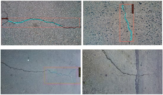 We tested the CRACK500 dataset using the completed training model, and some of the results are shown in Figure 11 and Figure 12. Faster R-CNN still performs well on different datasets with strong generalization performance. Mask R-CNN performs slightly worse, but is still valid. It should be noted that migration-learning based finetuning methods are very efficient. It is reasonable to believe that we will obtain even better results if we train a small amount for the CRACK500 dataset.