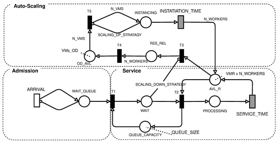 The proposed SPN model of cloud-based systems with auto-scaling is shown in Figure 2, being composed of three subnetworks: admission, service, and auto-scaling. The admission subnet generates the workload and represents the time between requests. It is composed of an ARRIVAL transition, which is a single server transition and has the expected mean arrival time value, and the WAIT_QUEUE place, which represents a request that is ready to enter the system.