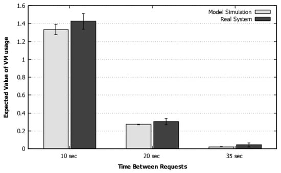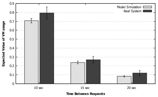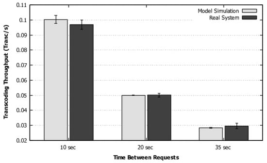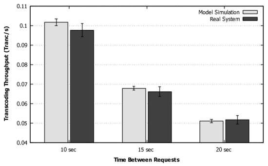 The validation of Scenario 2 was conducted with the change of the inter-arrival times for 10, 15, and 20 s. Additionally, videos were randomly selected during the execution of Jmeter. The throughput may be seen in Figure 7, and the elastic VMs usage in Figure 8. This second scenario also executed a total of 9.000 conversions. As the values from the model simulation are within the confidence intervals of the respective system measurements, we can also say that the model represents the system with 95% confidence.