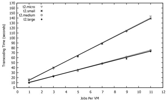 We will evaluate four VM types. The costs for each type of contract are the same as used in [43]. However, the service times for each type of VM will vary depending on the number of simultaneous transcoders each VM (N_WORKERS) will hold. Using the system described in Section 5.1, we measured the average service time for six distinct values of N_WORKERS: 1, 3, 5, 7, 9, and 11. The values found in this experiment are displayed in the points of Figure 9.
