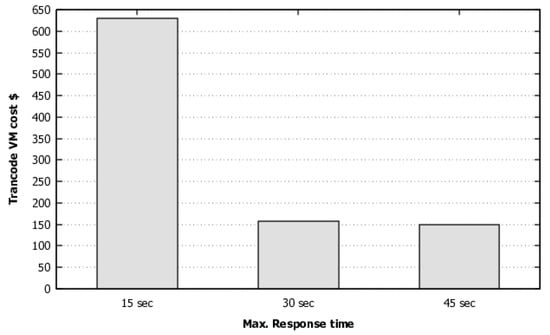 Table 11 shows the metrics for each solution. For the 45 s SLA, the cost is USD 148.74 (per year), and the average response time of that solution is 43.52 s. This system configuration also enables the conversion of 0.099 videos per second, and its usage of elastic VMs is 0.61. This result evidences that the single reserved instance is insufficient for attending the workload at all times; therefore, elastic VMs will be needed for peak periods in this case.