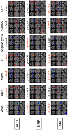 - Whitfield-Gabrieli, S.; Thermenos, H.W.; Milanovic, S.; Tsuang, M.T.; Faraone, S.V.; McCarley, R.W.; Shenton, M.E.; Green, A.I.; Nieto-Castanon, A.; LaViolette, P.; et al. Hyperactivity and hyperconnectivity of the default network in schizophrenia and in first-degree relatives of persons with schizophrenia. Proc. Natl. Acad. Sci. USA 2009, 106, 1279–1284. [Google Scholar] [CrossRef]