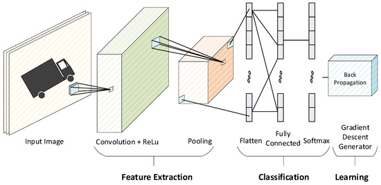 During training mode, the backpropagation calculates gradient descent in matrix dot products in the reverse order of the CNN layers. Softmax and backpropagation layers are also involved to further train the partially trained weights. As evident from