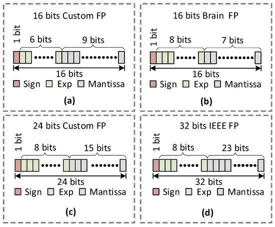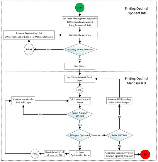 As shown in Equation (5), the exponent bit in the kth-iteration is increased while the overall data width (DW) remains constant as the Mantissa bit is consequently decreased. After fixing the exponent bit width, the algorithm calculates the performance metric (accuracy and power) using the new floating-point data format. In the experiment of this paper, the new floating-point format before Mantissa optimization was found to be (Sign, Exp, DW-Exp-1) with DW of 16 bits, Exp = 8, and Mantissa = 16 – 8 – 1 = 7 bits. Then, the algorithm optimizes each layer’s precision format by gradually increasing the Mantissa by 1 bit until the target accuracy is met using the current DW. When all layers are optimized for minimal power consumption while meeting the target accuracy, it stores a combination of optimal formats for all layers. Then, it increases the data width DW by 1 bit for all layers and repeats the above procedure to search for other optimal formats, which can offer a trade-off between accuracy and area/power consumption. The above procedure is repeated until the DW reaches maximum data width (MAX DW), which is set to 32 bits in our experiment. Once the above search procedure is completed, the final step compares the accuracy and power of all search results and determines the best combination of formats with minimum power while maintaining the target accuracy.