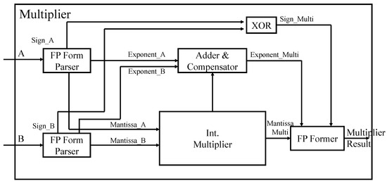 Unlike floating-point adder/subtracter, floating-point multipliers calculate Mantissa and exponent independent of the sign bit. The sign bit is calculated through a 2-input XOR gate. The adder and compensator block in