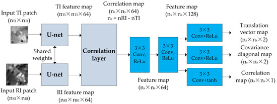 The DLSMarea structure uses the idea of the correlation layer proposed in [34]. The proposed CNN (Figure 1) takes as input the TI fragment of size pixels and RI fragment of size pixels and outputs the SM value in the search zone of size pixels, where . Both RI and TI fragments are transformed to feature maps of size and using U-net CNN [35] with weights shared between the RI and TI branches. The correlation layer is implemented as a convolution operation applied to each feature channel, with TI features serving as a convolution filter. The correlation layer produces a correlation map of size pixels. In total correlation maps are formed. The architecture allows a search zone of size , where is positive integer: We denote DLSMarea with a given as DLSMarea [], e.g., DLSMarea17 for .