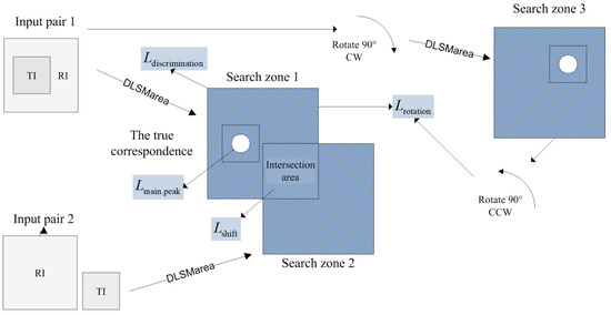 For training, we use pairs of registered multimodal images (see Experimental Section (Section 3) for a description of the training and test datasets). A pair of TI and two RI fragments are cut from a random location of a random image pair. The TI fragment has a size of 32 by 32 pixels. The first RI fragment has a size of and is shifted from TI such that the true PC is within the search zone. The second RI fragment has the same size but is shifted from TI such that the true PC is outside the search zone and search zones intersect between selected RI fragments. The third TI–RI pair is formed by rotating the first pair by 90°. This group of three RI–TI pairs forms one sample for the training of DLSMarea.