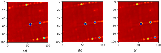 The “area” SM covering a larger search zone takes more time to train and is redundant in situations where the intended search zone is small. Ideally, a larger search zone can be covered by tiling SM maps calculated for smaller parts of the search zone. This type of nonoverlapping tiling is most likely to result in translation invariance errors. Training DLSMarea with the loss reduces this source of error but cannot eliminate it completely. The blocking effect can be reduced by means of overlapping tiling with a moving average of SM maps. The best results are expected from an overlapping step of one pixel. However, this variant is not practical due to its high computational complexity. Illustrations of the SM blocking effect are given in Figure 3, where nonoverlapping, overlapping with tiling steps of 12 and 1 pixels are shown. For nonoverlapping tiling, the blocking effect is noticeable but disappears for overlapping tiling (compare Figure 3a with Figure 3b,c). Let us evaluate overlapping steps sufficient for constructing large SM maps from partial maps.