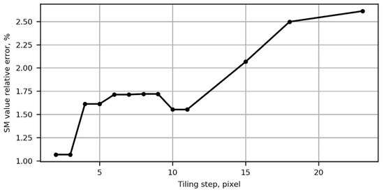 The dependence of on the tiling step is shown in Figure 4. For nonoverlapping tiling (right part of the plot), the relative error takes on the largest value of about 2.6%. The relative error has the tendency to decrease monotonically with a reduction of the tiling step. Selecting a tiling with a step close to half the size of the SM map (e.g., 7 or 12 pixels for an SM map of 25 by 25 pixels) decreases the relative error by about twofold (to 1.5%), removes visual blocking artifacts and allows detecting putative correspondences at the edges of SM map blocks. We chose this tiling scheme for all future experiments.