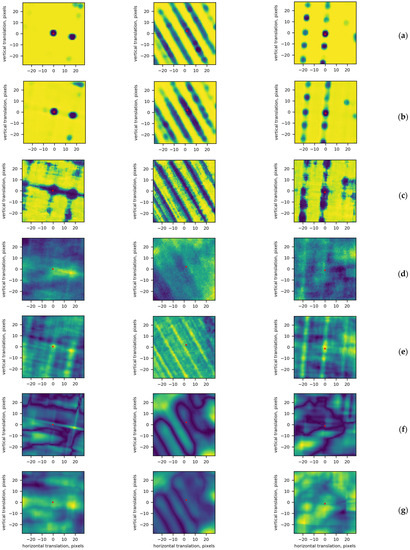 In this paper, we address one particular element of this registration scheme, namely the exhaustive search of PC between two images. Exhaustive search is justified when the search zone has a reasonable volume. For example, in remote sensing, images acquired at different time instances or by different sensors may be initially registered using the sensor orbital parameter and digital elevation model (DEM) data [6,20]. The remaining matching error can be approximated locally by the translation error with small rotation and scale errors [21,22,23]. The translation errors are limited by the accuracy of the sensor geopositioning and are typically less than 100 pixels [8]. Exhaustive search is useful for matching ground control points between radar and optical images [6]. A similar task arises in computer vision for the stereo matching problem [24]. In this case, the distance to a point is computed by comparing the patches between the left and right rectified images. The search zone along the distance is transformed into a search along the disparity between fixed left fragments and right fragments moving along the horizontal epipolar line. The similarity structure along the disparity coordinate can be computed by an exhaustive search using a patch-matching CNN, as in [11], and may also have false matches for regular textures. If the search zone is too large due to large initial errors, including rotation, scale or translation and 3D viewpoint change, the keypoint approach is beneficial. In complex cases, such as multimodal registration, keypoint detection becomes unreliable, and exhaustive search is preferable.