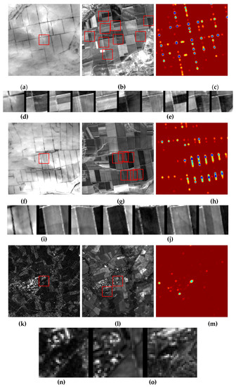 Examples of SM maps and matches found. TI fragment covering the search zone with the part to be searched is marked by a red square (a,f,k), RI fragment covering the search zone where found matches are is marked by red squares (b,g,l), SM map (c,h,m) with red color corresponding to a low similarity and blue color to a high similarity, TI fragment (d,i,n) and RI fragments found (e,j,o), The leftmost RI fragment corresponds to the true correspondence; the following fragments are plausible false matches.