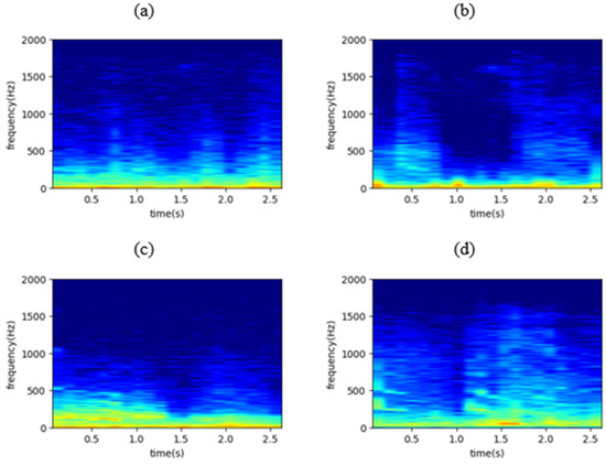 The spectrogram of (a) a normal respiratory cycle, (b) a respiratory cycle containing crackles, (c) a respiratory cycle containing wheezes, and (d) a respiratory cycle containing both crackles and wheezes, where x axis represents time in seconds and y axis represents frequency in Hz.