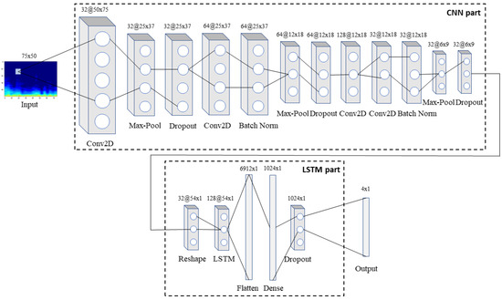 The architecture of the proposed model: the input spectrogram is passed through the CNN part of the network to extract features, which are then passed through the LSTM part so that the long-term dependencies between them are identified and memorized. Finally, the combined features are fed into the output layer that predicts the class to which the input belongs to.