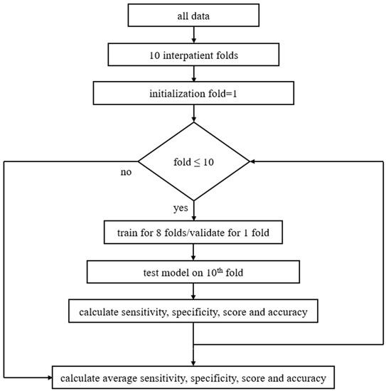 Block diagram of the proposed method including pseudocode: at first data are separated into ten interpatient folds, then 10-fold CV is being set, and the training process is repeated for all groups of folds. In each loop the model is trained and validated for nine folds, then tested on the 10th fold. Next, the micro-average values of the sensitivity, specificity, score, and accuracy are calculated. As soon as training is finished for all folds, average sensitivity, specificity, score, and accuracy are extracted.