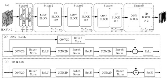 Migration ResNet50 base-layer network model framework: (a) schematic diagram of base-layer network model; (b) CONV BLOCK network structure module; (c) ID BLOCK network structure module.