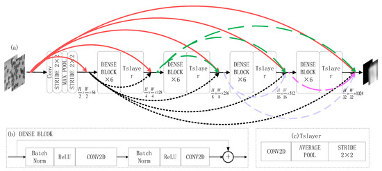 Migration of DenseNet121 base-layer network model framework: (a) schematic diagram of base-layer network model; (b) DENSE BLOCK network structure module; (c) Tslayer network structure module.