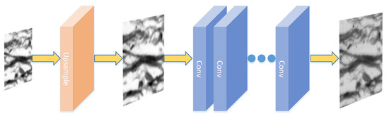 After feature fusion, the upsampling module is composed of convolution layer and pixel recombination layer to sample the feature map to the same spatial size as the network input. Through a convolution layer and a pixel recombination layer, the space size can be doubled, and the pixels are continuously convoluted upward until the pre-upsampling reconstruction module receives the dual-channel feature map output. The low-resolution image is up-sampled at the front end of the neural network. As shown in Figure 6, the blurred image can be made clear, and the operations of feature extraction, mapping and reconstruction are completed in the high-resolution space.