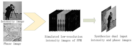 The photographer and street map are used as amplitude and phase images, respectively. The process of simulating experimental data is shown in Figure 7. In the simulation process, the NA of the objective lens is set to 0.13, the wavelength is set to 0.505 μm, and the simulated planar array light source is 13 × 13.169 low-resolution intensity images with 48 × 48 pixels were obtained by using the FPM imaging process. The dual-channel complex amplitude image was reconstructed as the model input through the traditional iterative phase reconstruction method. In order to simulate the influence of noise on the reconstruction results in the image acquisition process of the imaging system, the complex amplitude image input model with noise is reconstructed by adding Gaussian noise while obtaining low resolution in the FPM imaging process.
