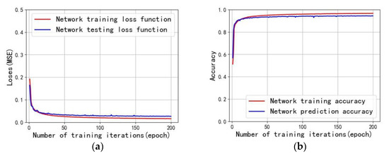 In this paper, the stability of the network model is measured by the fitting curve of the loss function and accuracy index value of the training and test data output under different epochs, as shown in Figure 9. Figure 9a shows the curve of the number of training iterations and the loss function. As the number of iterations increases, the closer the fitting curve of the reconstruction network training loss function and the reconstruction network prediction loss function is to the model, the better the stability is. The prediction curve does not shake violently, and the model does not appear gradient explosion. Figure 9b is the curve of the number of training iterations and the accuracy rate. The closer the fitting curve of the reconstruction network training accuracy rate and the reconstruction network prediction accuracy rate is, the higher the predicted result value, and the better the reconstruction effect.